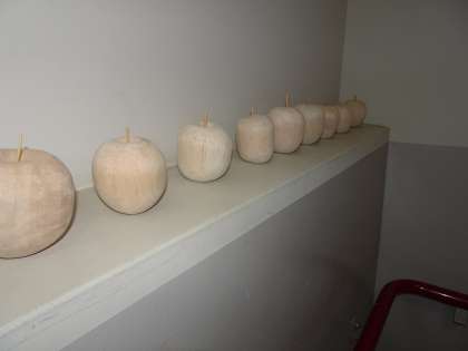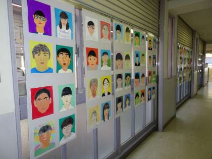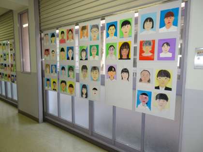 自画像です。絵で誰かを当てようとしている人もいました。バルサ材で作成したリンゴも展示中です。