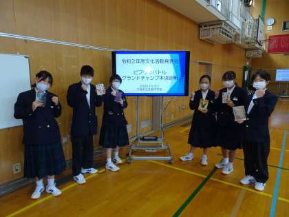 午後は体育館でビブリオバトルグランドチャンプ本決定戦がありました。各学級、各学年の予選を勝ち抜いた6名が、天満中最強をかけて戦いました。