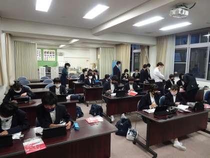大阪大学からは5人の先生に参加していただき、来週の期末テストに向けて2年生数学の復習をしていただいています。生徒はタブレットに送られてくる映像を見て、分からない箇所は質問し学習を進めていました。