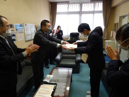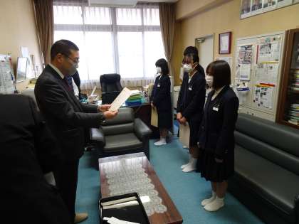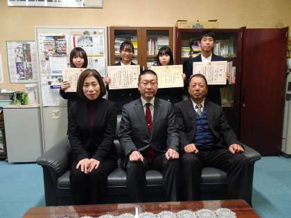 今日は校長室で「税についての作文」の表彰が行われました。毎年、税務署の方に来ていただき「租税教室」を開催していただいたり、国税庁主催の「税についての作文」に応募したりし、3年生公民の授業を充実させています。今年は4名の生徒の作文が北税務署長より表彰されました。生徒の活動が校外でも認められることは非常に喜ばしいことですね。