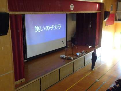 。笑いを一言で例えると「エネルギー」「幸福」「平和」など、様々なことばが連想されるとの校長先生からお話がありました。後半は聞き覚えのある出囃子の後、2年生の有志が漫才を披露しました。プロ顔負けの仕上がりで、場内からは爆笑が巻き起こっていました。まさに笑いのエネルギーを感じました。