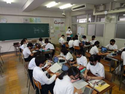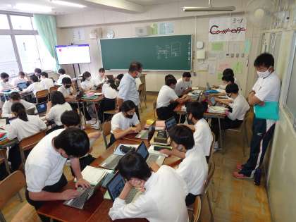 写真は3年生理科の様子です。今年度より1人1台端末の本格的運用が開始され、