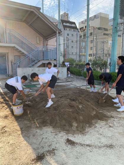 今日の放課後、グランドを使用する運動部でにがりまきを行いました。本校では年二回、メンテナンスのためにがりまきを行っています。また、山土も搬入され、グランドの凹凸を今後埋めていきます。体育大会をベストコンディションで実施するため、頑張ってくれました。どうもありがとう!