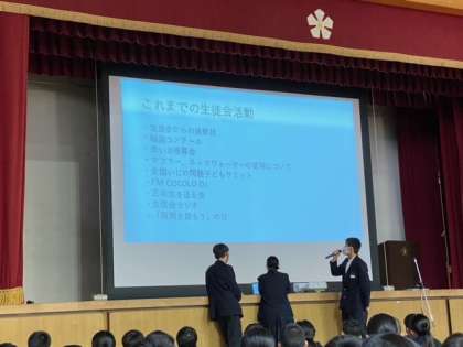 また、前期生徒会役員だった3年生がこれまでの生徒会活動を振り返り、企画から通して学んだことを自分の言葉で話してくれました。