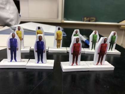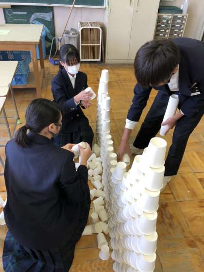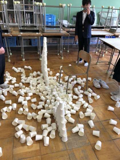 こちらは美術室で行われた紙コップを積み上げてピラミッドを作る課題。もう少しで完成のところで崩れてしまうことも。