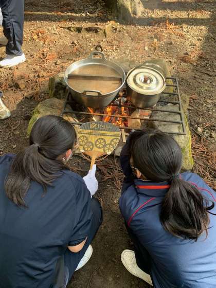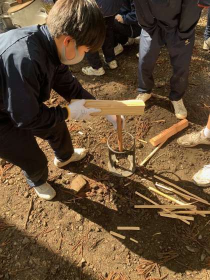火加減はどの班も悪戦苦闘しています。細かい薪も作りながらの作業です。