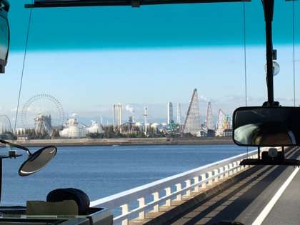 ナガシマスパーランドの絶叫マシンが、前方に見えてきました!生徒たちは、バス車内ですでに興奮気味です。雲一つない快晴の中、