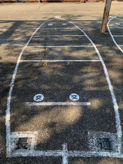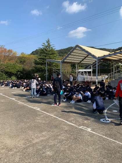 カッター研修前の説明を聞きます。地面に描かれた場所に座ります。