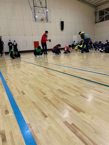紙飛行機飛ばしです。30秒で折った紙飛行機を遠くまで飛ばします。大盛り上がりです。