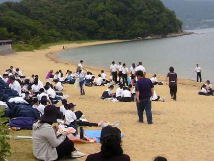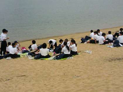 海岸での昼食、みんな美味しそうに食べています。