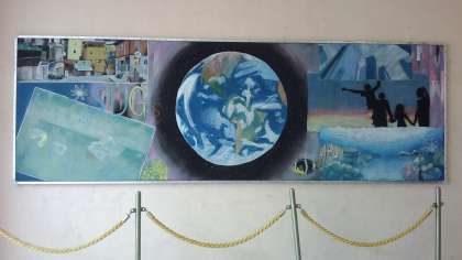 昨年度から取り掛かっていた、美術部による「SDGs」をテーマにした黒板アートが完成しました。テーマに合わせて下絵を考え、美術部の3年生を中心に放課後の限られた時間を使って作業しました。