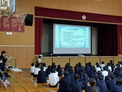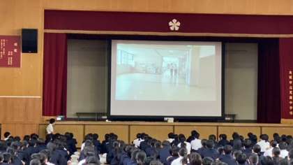 生徒会が撮影制作を行った「これっていじめ?」という動画を視聴し、みんなでいじめについて考えました。動画の後には意見を出し合い、様々な捉え方を知ることができました。自分達の身近にあるちょっとした行動がトラブルに発展することもあります。自分の考えだけでなく、相手の気持ちを想像したり、寄り添う力が大切です。