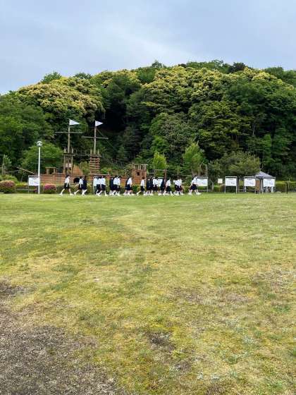 次は芝生の広場をウォーキングです。明日は公道にでるので、安全に移動できるように声をかけながらクラスごとに歩いています。