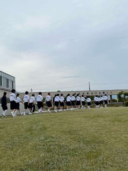 次は芝生の広場をウォーキングです。明日は公道にでるので、安全に移動できるように声をかけながらクラスごとに歩いています。