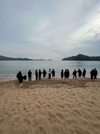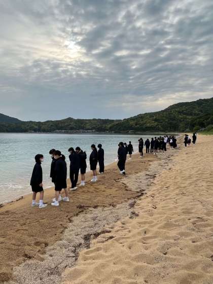 早く片付けが終わった班は宿舎前の砂浜で散歩です。波の音が気持ちいいです。