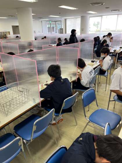 朝食はイワシのみりん干し、ホタテフライ、ひじきの煮物、みそ汁です。黙食でいただいています。おかわりもたくさんあります。