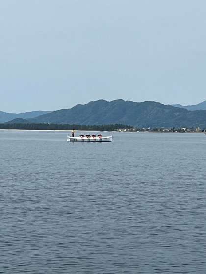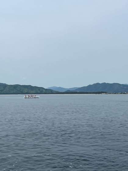 船の向こう側が明日ウォーキングをする天橋立です。