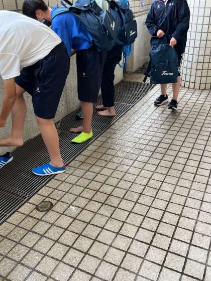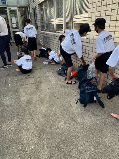 午後の活動が全て終了しました。怪我やトラブルなく終えることができました。足元が濡れているので足を洗っています。