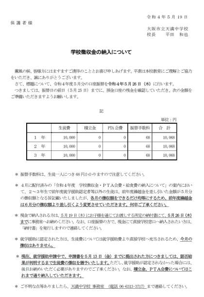 なお、現金で納入される方は、別途お渡ししております所定の納付書にて5月26日(木)までに学校事務室へお納めください。
