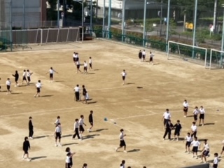 2年生は、来週の球技大会に向けて、クラスごとに練習していました。グランドのあちこちで歓声が上がっていました。
