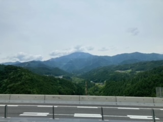 2回目のトイレ休憩です。予定どおりに到着しました。車窓からは豊かな山並みが見えています。