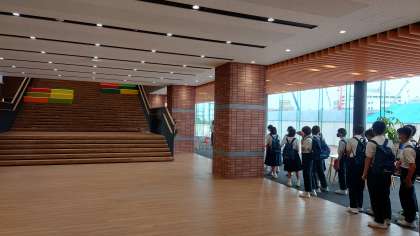 広いキャンパスの見学を行っています。中学校とくらべられないくらい広く、おしゃれな施設です。