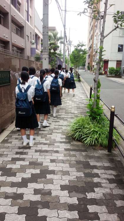 2,3年生は総合学習(キャリア学習)の集中実践として系列別に各グループごとに大阪市内の各場所に行き学習します。まず、集中実践の出発です。