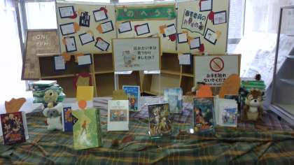 テーブルの上に地面を想像させる布を敷き、本を数冊たいらに重ねて樹木に見立てました。紅葉して落ちていた枯れ葉を扇町公園から拾ってきて散らし、秋のムードを出しています。また、図書委員が本の題名・著者名、簡単なあらすじやポイント等、イラストと共に書いた紹介文を、木々の枝葉の一枚一枚に見立てています。