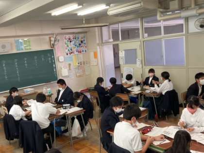 1年生の道徳の授業では、教科書に載っている「島耕作」の教材を元に議論をしていました。生徒たちはいろいろな捉え方を学び合っていました。