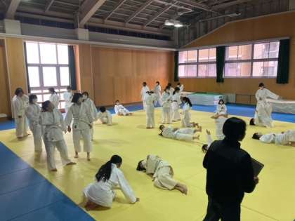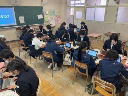 ?1年生の体育では、男女ともに柔道の授業が行われていました。柔道着姿も勇ましく、受け身の練習に取り組んでいました。数学の授業では、図形について、各自の端末を使用しながら、グループで話し合って学びを深めていました。