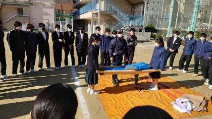 北区消防署の方より、消火訓練、地震体験車、搬出訓練を受講しました。