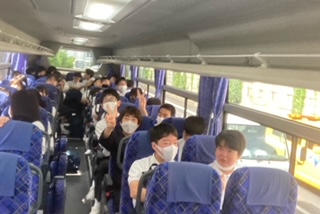 保護者の方々、先生方の温かいお見送りを受けて、バスは高速道路を流れています。