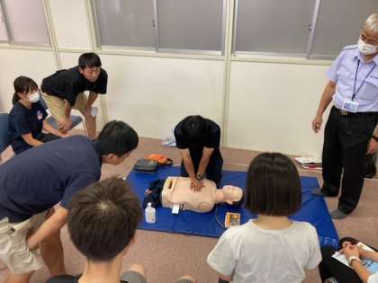 教職員は水の事故や熱中症など万が一の時に備えて、真剣な面持ちでAEDの操作などに取り組んでいました。