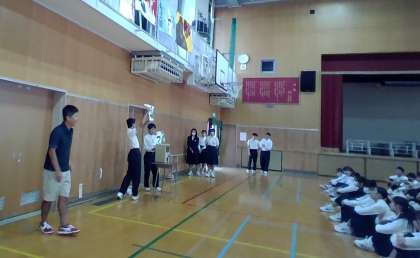 今朝は3年生の学年集会が開かれ、10月25日に行われる合唱コンクールの歌唱順の抽選が行われました。手作りのガチャガチャを回して、出てきたカプセルの中にある紙をドキドキしながら開ける文化委員。結果は 4組→2組→3組→1組 の順となりました。