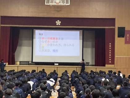 また、生徒会からは、赤い羽根共同募金についての説明がありました。募金の使われ方、なぜ赤いのか、などスクリーンを使って説明していました。