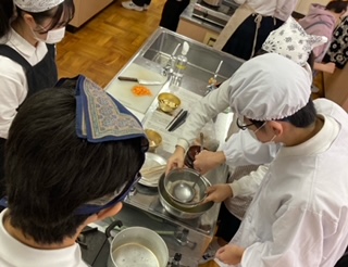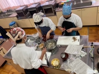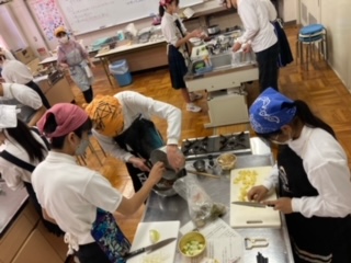 カツオ節やこんぶなどで出汁をとり、具材もお豆腐やさつまいもなど班ごとに違うお味噌汁をお互いに助け合いながら調理に取り組みました。