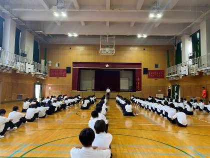 校内では朝から1年生の学年集会がありました。今日は発先生からのお話で、あいさつは『あかるく・いつも・さきに・つづける』を心がけて、このまま良いところは継続していきましょうという内容でした。また、お話の後には保健委員と風紀委員による「爪・ハンカチ・ベルト・名札・靴下」の点検がありました。中学校にも慣れてきた7月、身だしなみを整える習慣をつけましょう。