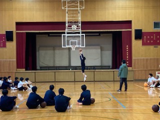 生徒がレイアップシュートの見本を見せ、その後グループに分かれて練習しました。