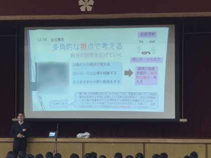 今日の全校集会は「多角的な視点で考える」がテーマのお話でした。
