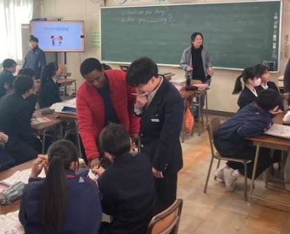 1年生の英語の授業では、ジェスチャーゲームに取り組んでいました。C-NETの先生が出す動作に関する問題をジェスチャーで表現し、解答者が英語で書いて解答していました。グループで協力してとても盛り上がっていました。