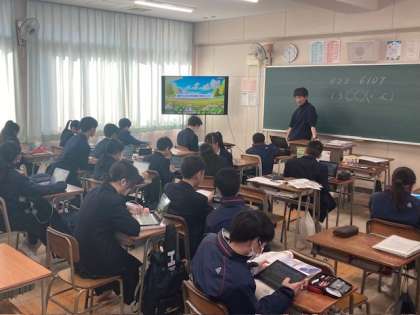 理科の授業では、一人一台端末を活用してクイズ形式で単元の復習に取り組んでいました。こちらは個人戦でしたがとても盛り上がっていました。