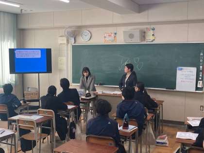 3年生の家庭科の授業では、企業の方にゲストティーチャーとして金融と保険についての講義をしていただきました。中学生と年齢の近い方からのお話で、近い未来に自分自身に起こりそうなことなので興味津々な様子でした。