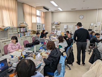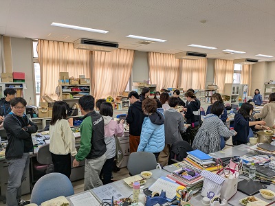 本日、扇町小学校で給食試食会が開催されました。そこに、天満中学校教職員も参加し小学校の教職員の皆さまと一緒に給食をいただきました。