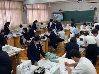 2年生の家庭科の授業では、巾着づくりに取り組んでいました。慣れない手つきながらも針やミシンを使って丁寧に仕上げていました。
