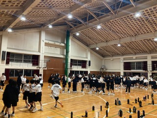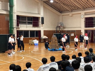 レクリエーションでは、係の生徒たちが工夫を凝らしたオープニングセレモニーを披露し、さまざまなゲームで盛り上がっています。