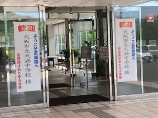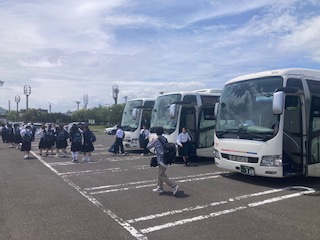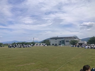 予定通り昼食場所に到着しました。晴天の下、クラスごとに広場でお弁当を食べています。