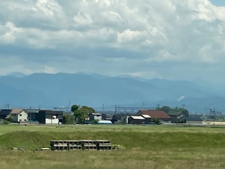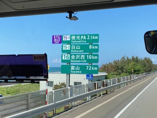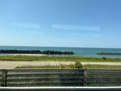 バスの車窓からは、左に日本海。右には、雪が残る白山?が見えます!