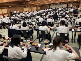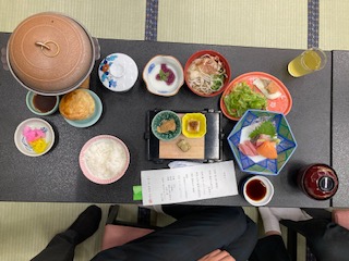 豪華なホテルの大きなお部屋で北陸の海の幸、山の幸をふんだんにつかったお料理をお腹いっぱい食べて、レクリエーションに備えてください。いただきます。
