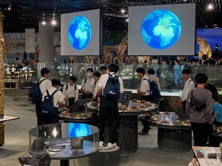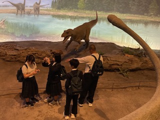 生徒たちは、展示されている恐竜の化石を修学旅行の思い出のひとつとしてカメラにおさめていました。