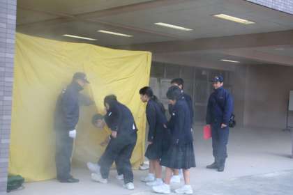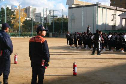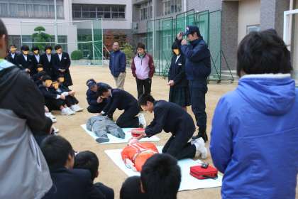 11月29日(金)6限目に、避難訓練を実施しました。「震度7の地震が発生し、その後、調理室より出火し、火災となった」という想定で、全生徒・教職員が、各教室や特別教室などから運動場へと避難しました。その後、3年生が「煙トンネルくぐり」、2年生が「心肺蘇生法及びAED実技指導」、1年生が「消火器使用訓練」の実技講習を受けました。最後に北消防署の方から講評をいただき、無事に訓練を終えました。